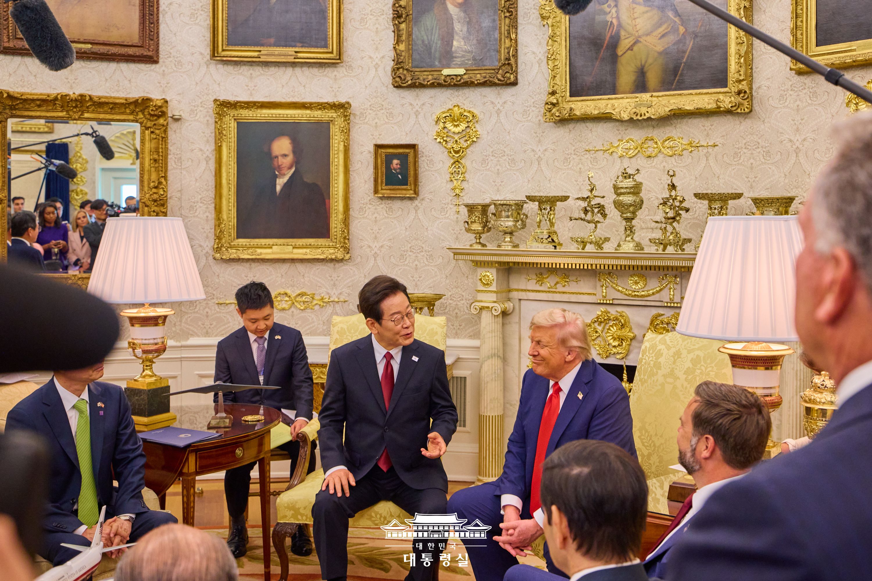 식사를 마친 후 트럼프 대통령은 집무실로 돌아가 조지 워싱턴 링컨 등 역대 미국 대통령들의 초상화를 직접 소개해 주었고, 이재명 대통령이 이시바 총리의 사진첩에서 봤다고 언급한 트럼프 대통령의 피습 사진이 실린 책을 선물하기도 했습니다.